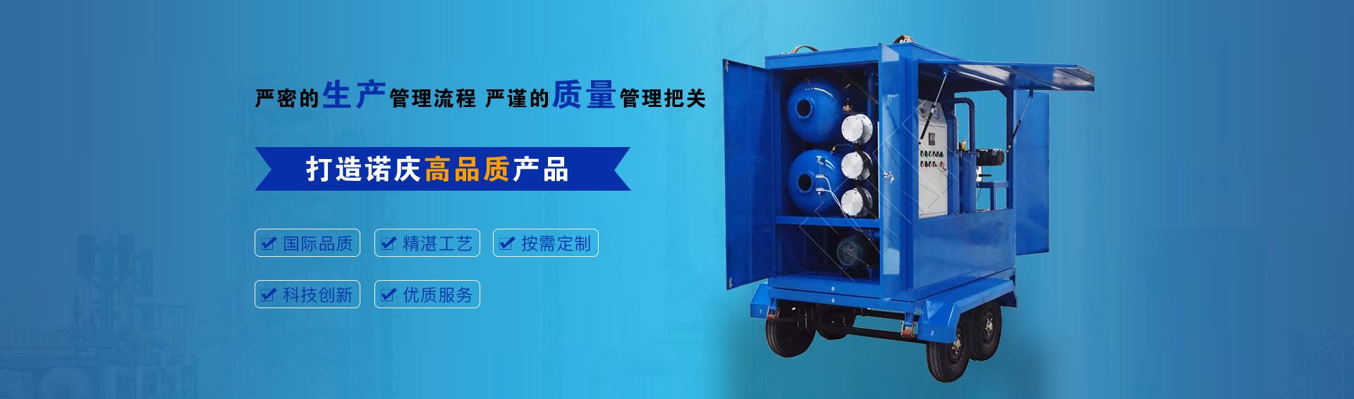 重慶諾慶機電有限公司是一家專業的濾油機設備生產企業,公司是集真空濾油機研發,生產和銷售為一體的股份制企業,公司擁有1800平米生產車間,注冊資金1000萬元。經過十年的不斷發展,公司已經成長為一個集濾油機,真空濾油機制造,服務,貿易為一體的綜合企業。重慶諾慶產品廣泛的應用在電力,石化,礦山,造船,鋼結構,橋梁,汽車,鐵路等不同行業。同時···